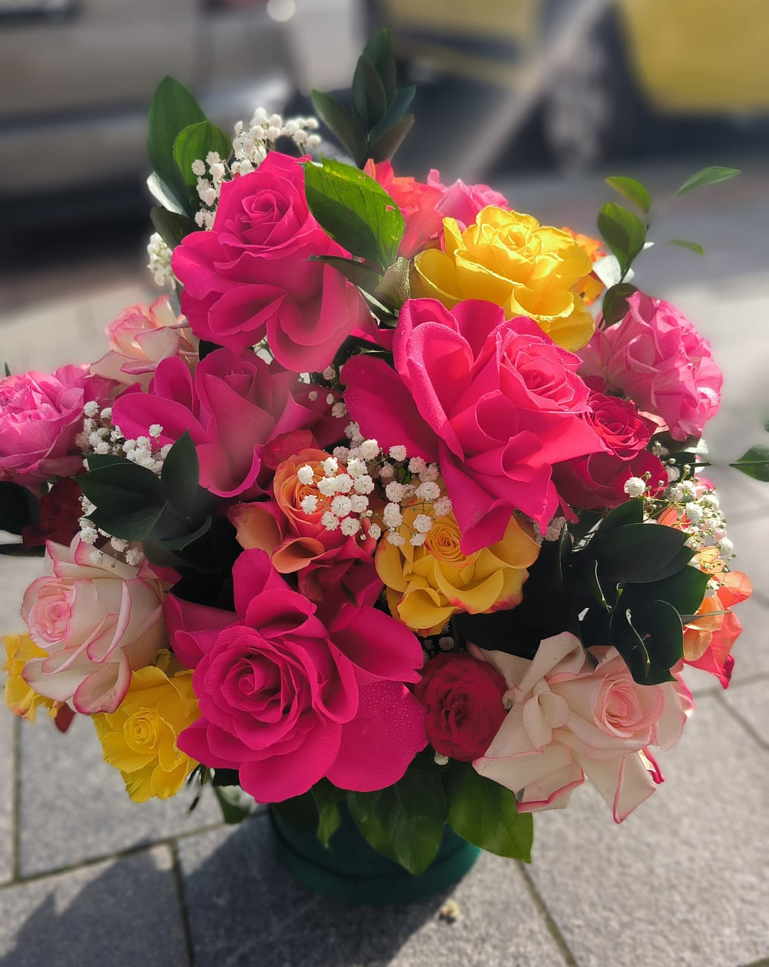 Mix de trandafiri de calitate, trandafiri Ecuador, gypsophila plus verdeață ornamentală.