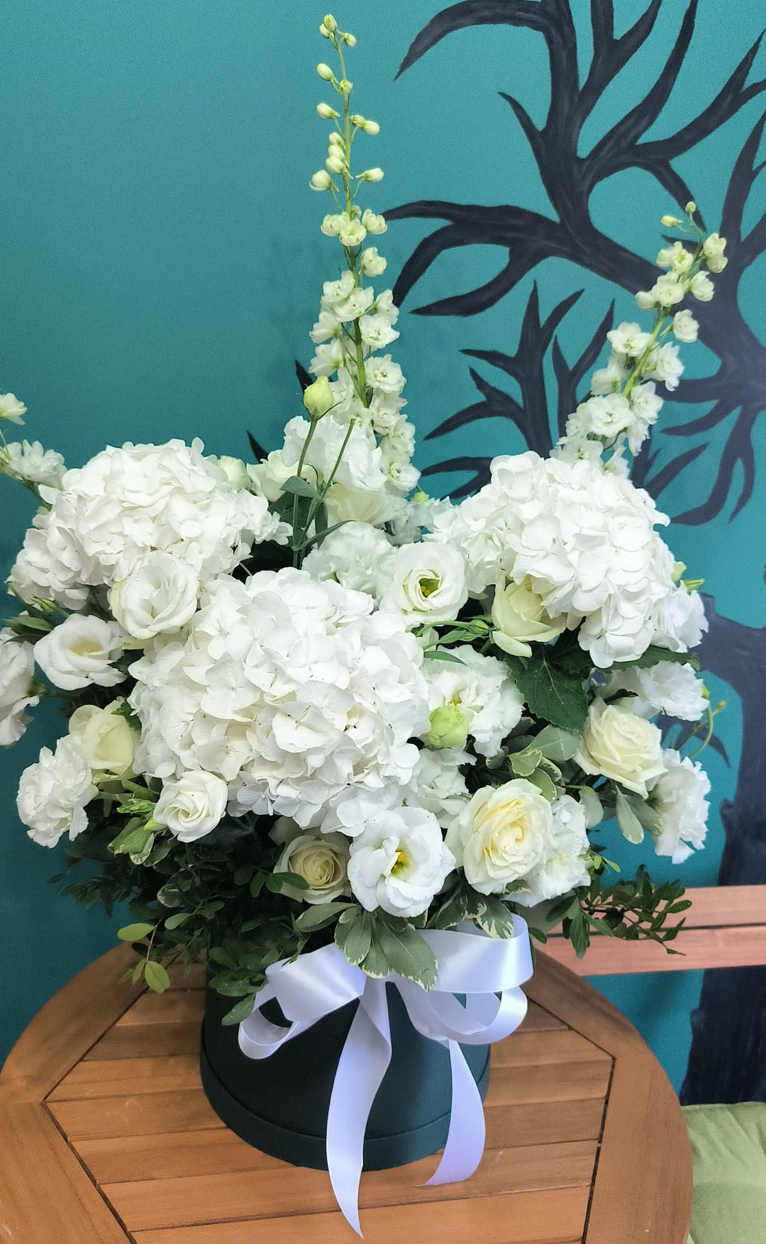 Hortensia alba, delphinium, lisianthus alb, trandafiri albi plus verdeață ornamentală.