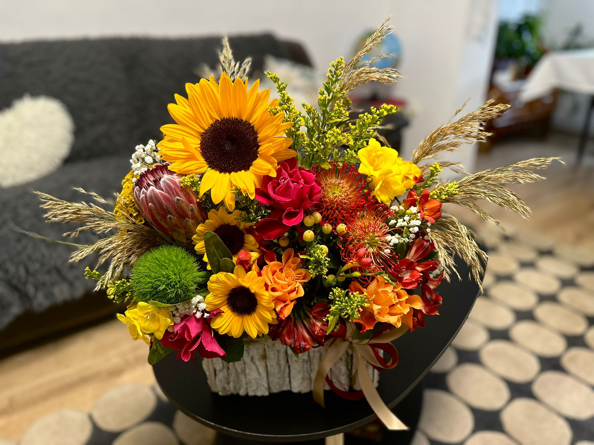 Floarea soarelui, trandafiri in culori tomnatice, leucospermum,proteea king,solidago,plus verdeață ornamentală.