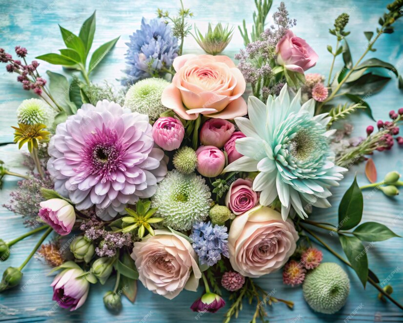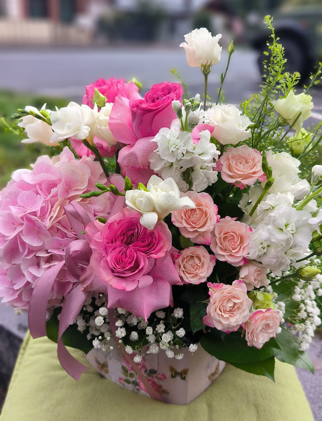 Hortensia roz pal, trandafiri roz Ecuador, miniroze, matiola, frezii albe, gypsophila plus verdeață ornamentală.
